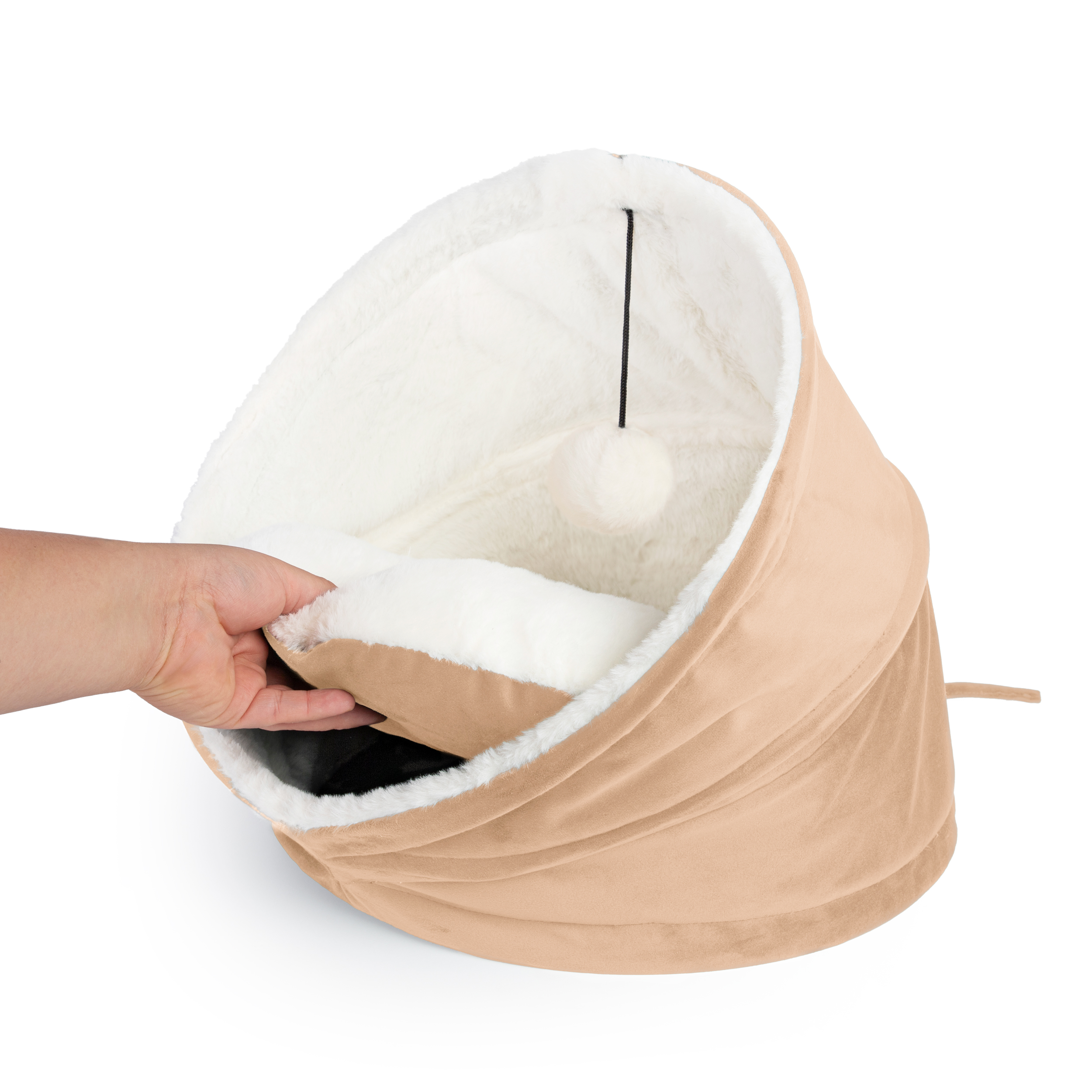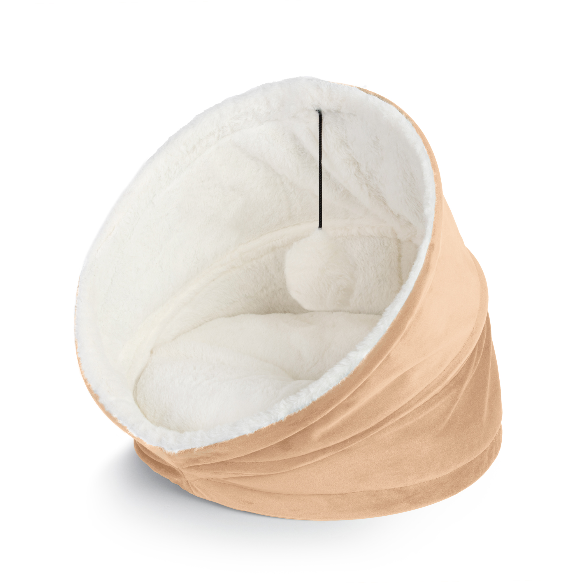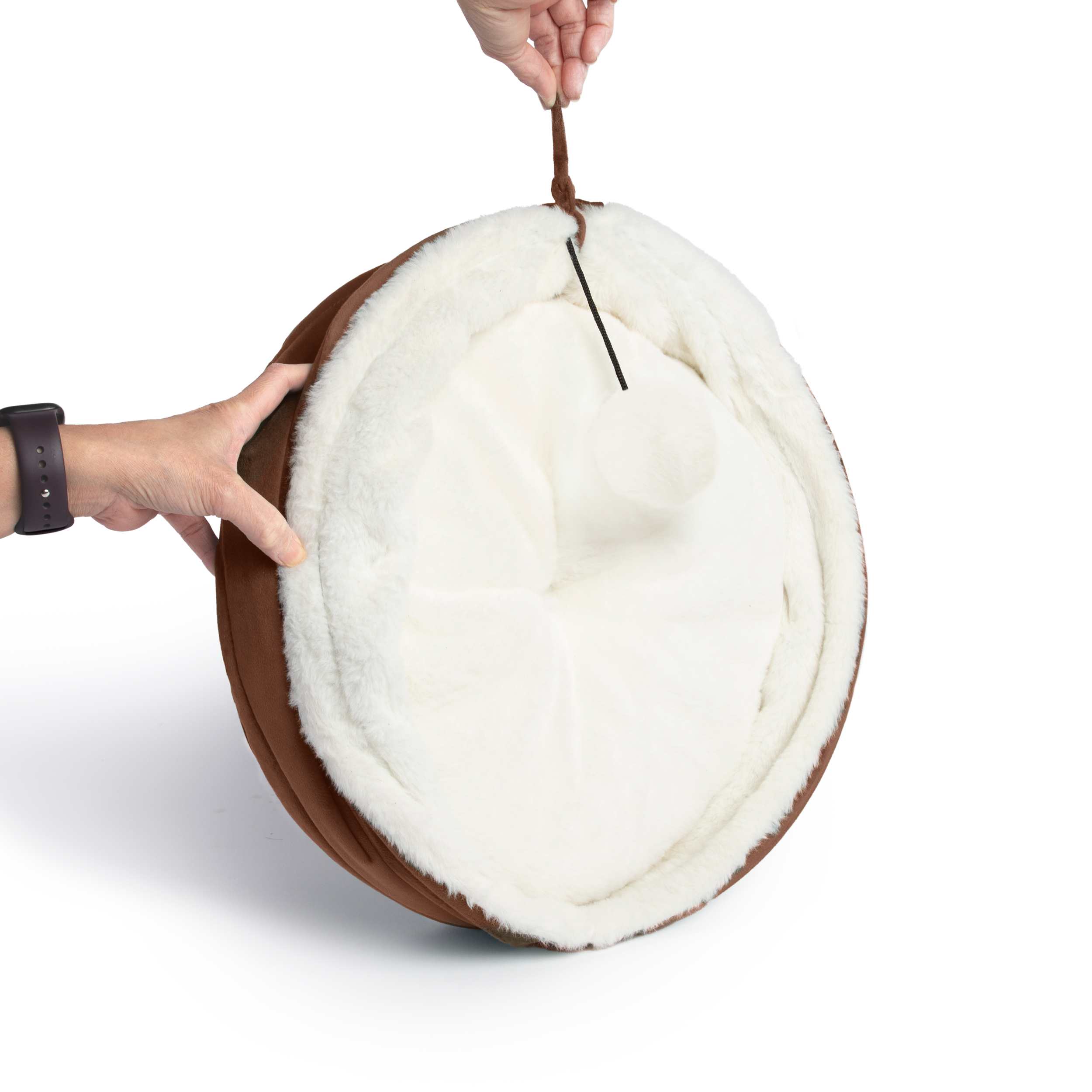 The sleep and sitting area offers a reversible Ultra Plush Faux Fur material. Your pet will relax and enjoy sitting, sleeping, and playing as it comes with a faux fur hanging toy in our plush foldable Cat House. The foldable feature allows for easy travel or storing. It is a puurr-fect snug and secure space for cats to nap or lounge while feeling safe and protected.