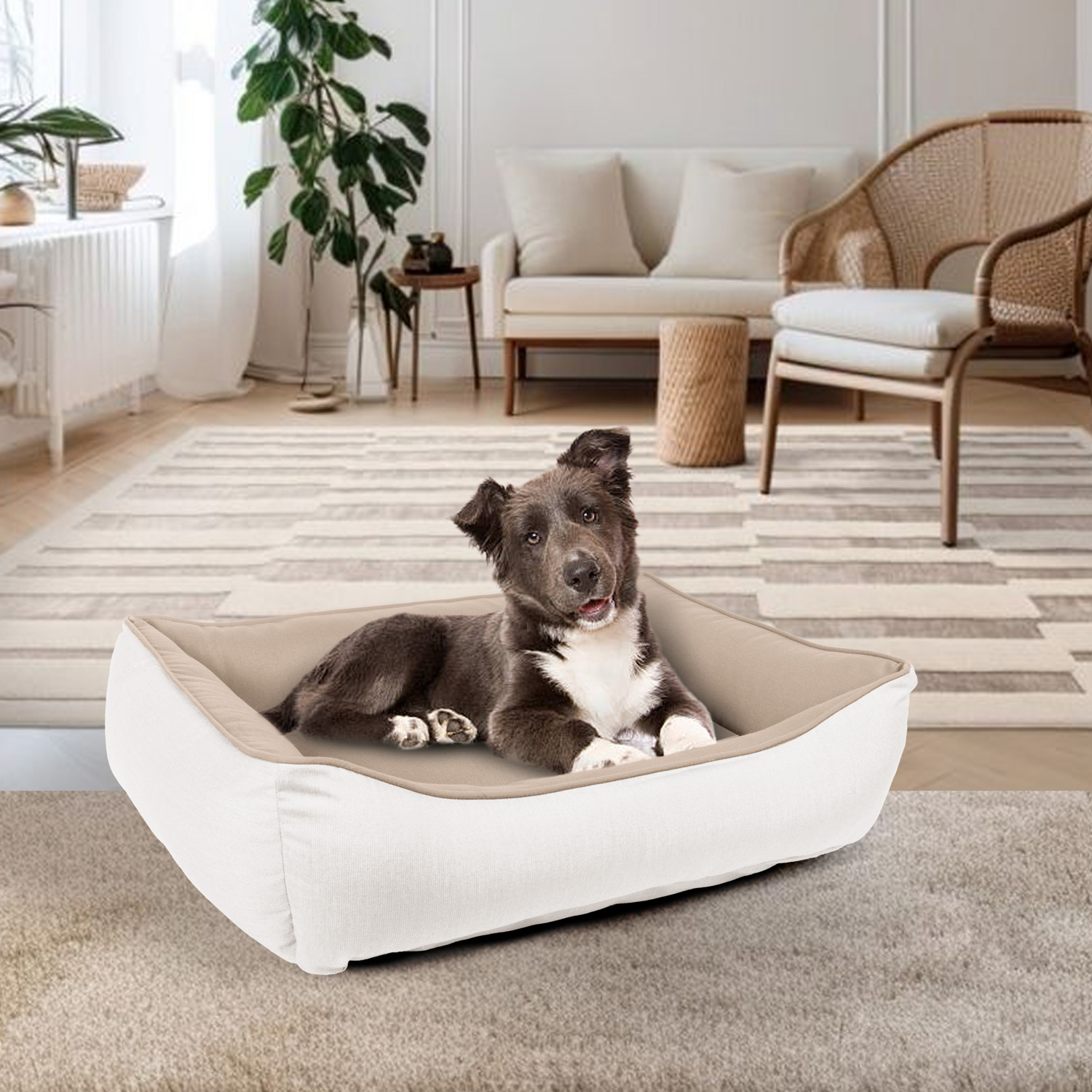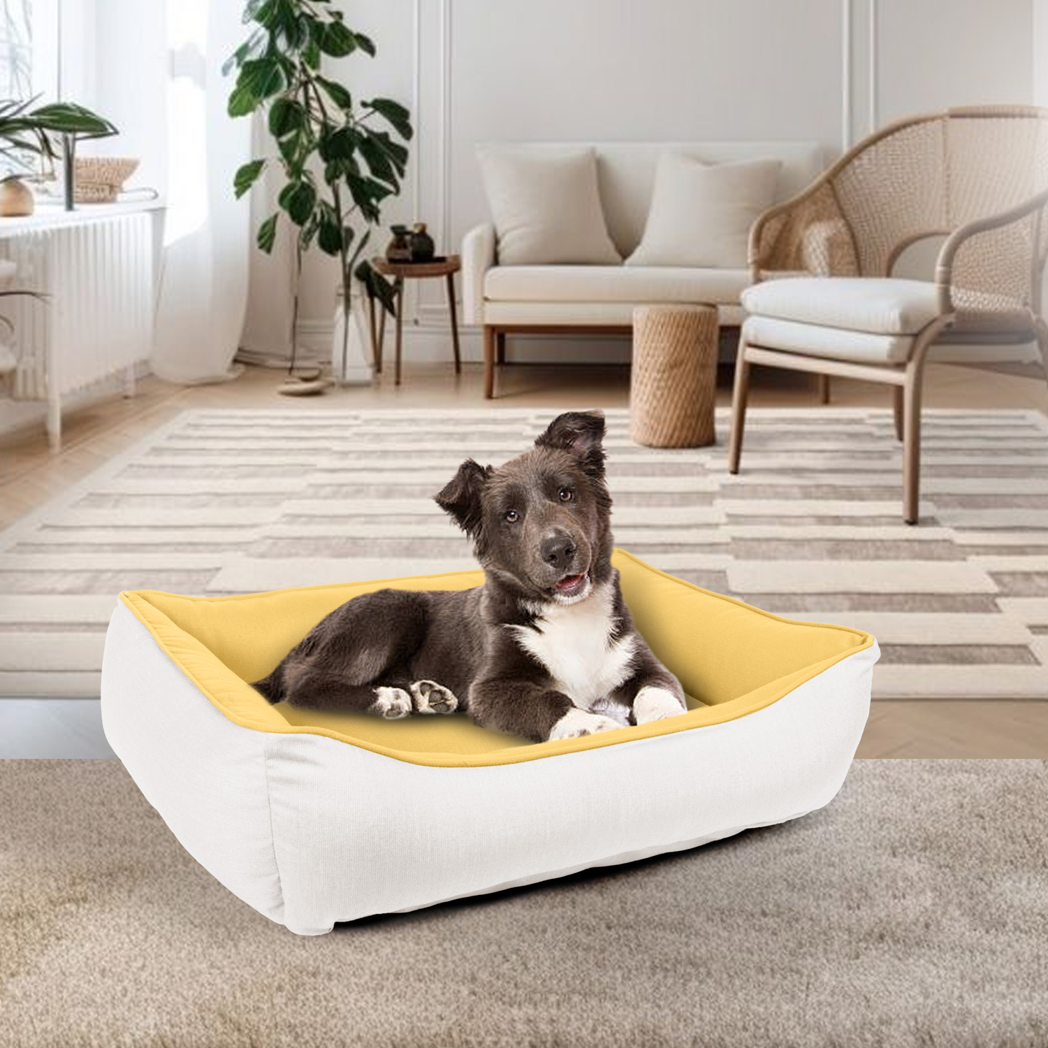 The multi-purpose classic rectangular design is ideal for any atmosphere, living room, bedroom, sunroom, patio, car, crate, porch, pool-side lounging, or pet house. The water-resistant dog bed surface is made of high-quality Sunbrella acrylic fabric which allows you to let your fur baby lay on while they enjoy the sunshine and have a quality sleep while indoors, outdoors or traveling.